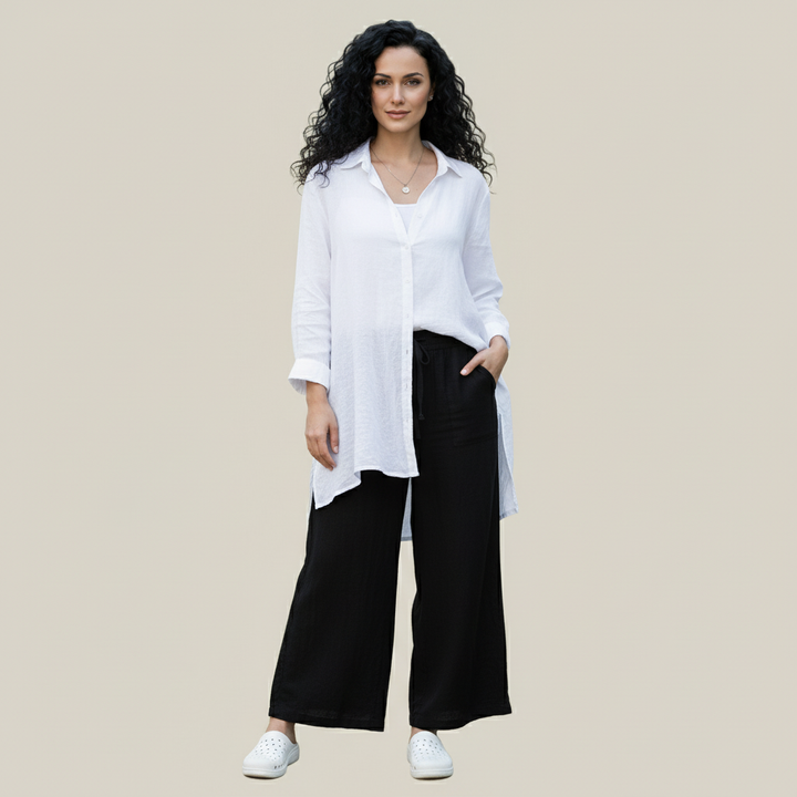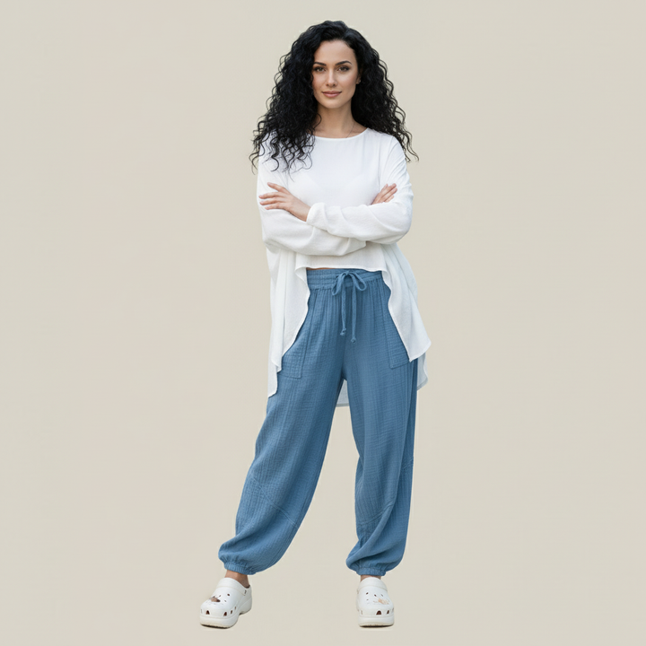 Loose pants with a wide and airy cut, made of a pleasant to the touch fabric and suitable for any season. An elastic waistband ensures a perfect fit and comfort throughout the day, and the practical pockets add both utility and chic. Ideal for everyday wear - the flattering look and uncompromising comfort will make them a must-have item in your wardrobe.