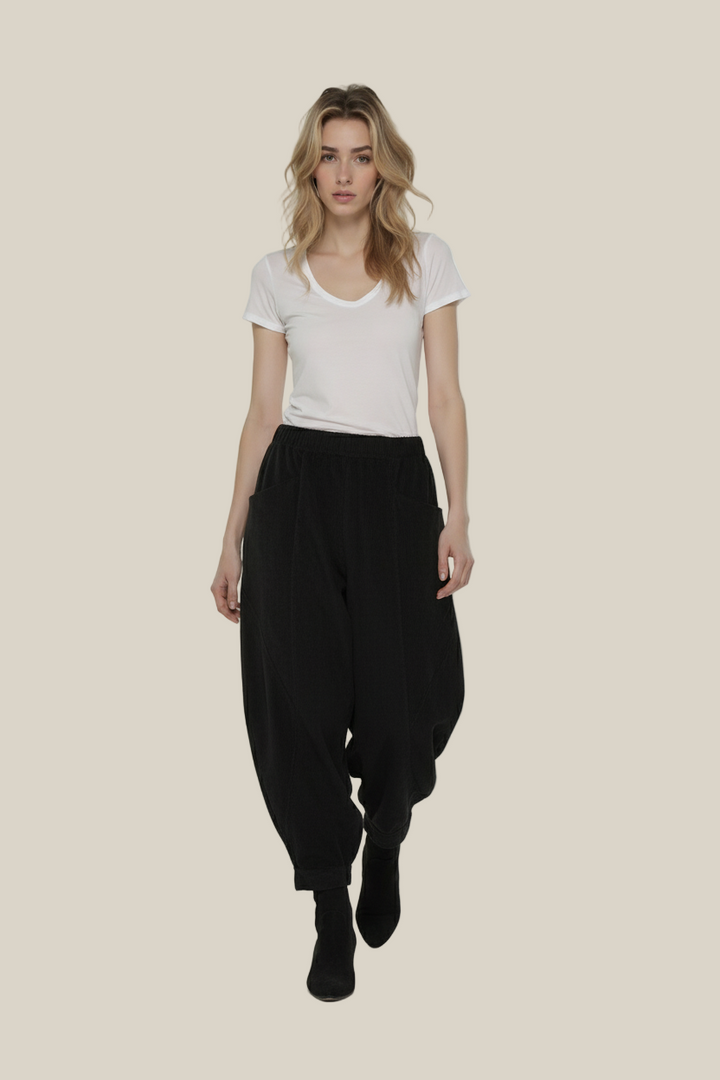 Thick, wide corduroy pants in a flattering jogger cut and high waist โ€“ a winning combination of comfort and style. The ankle length and tailored cut provide a fashionable look that is suitable for both home and going out.