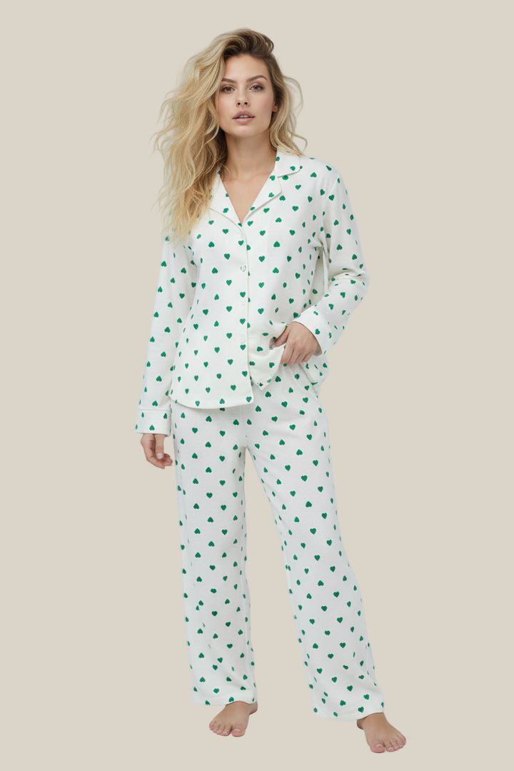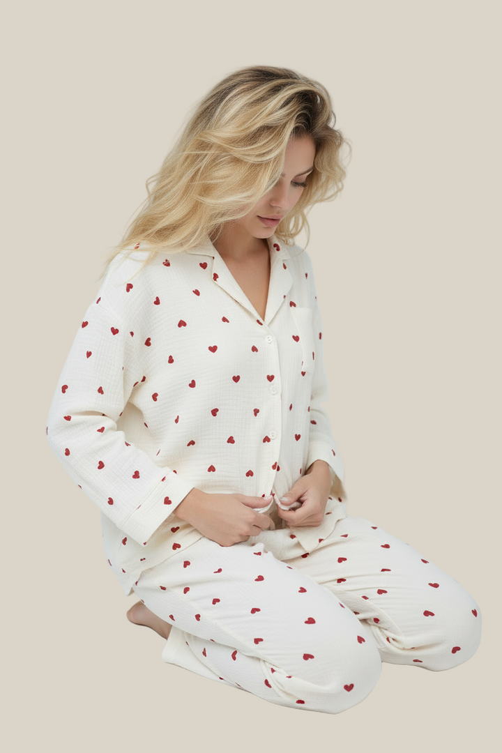 סט פיג׳מה נשי 100% כותנה מגיע עם הדפס לבבות חולצה ארוכה עם כפתורים ומכנס תואם לסטייל רך, נקי ומפנק בלילה.