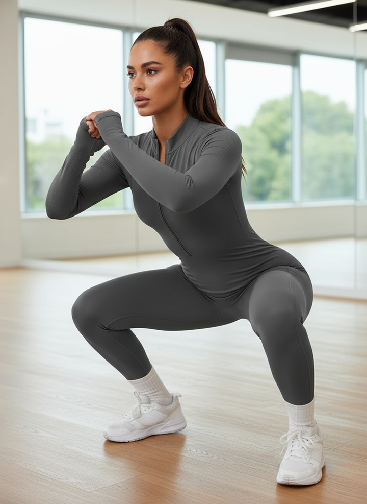 אוברול ספורט עם רוכסן – בגד גוף ספורטיבי לנשים, מתאים לחדר כושר, ריצה, יוגה ואימונים. עיצוב קצר, נוח ונושם, אידיאלי לקיץ.