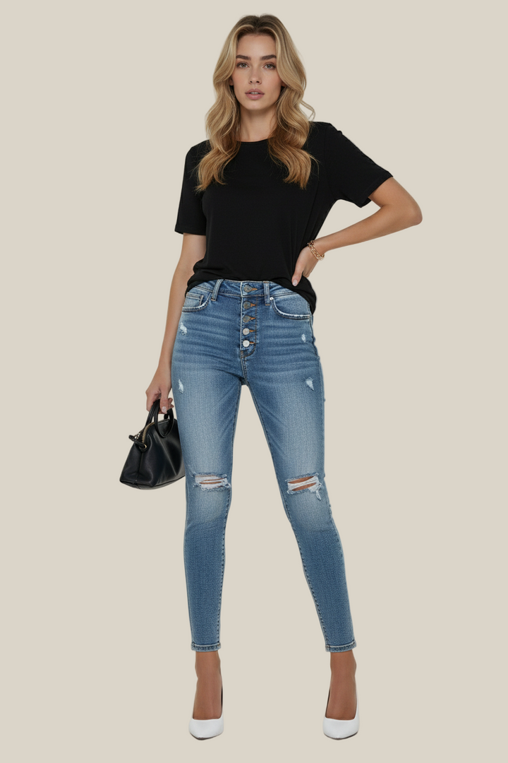 Women's shapewear jeans in a fashionable cut with a precise urban touch. A flattering design with decorative buttons and subtle rips that add a playful and modern style. Made of high-quality denim fabric, fitted to the body and flatteringly emphasizes the waistline. Perfect for a chic everyday look or a light evening outfit. Especially suitable for summer - with a precise ankle length and a kick-ass style that you won't miss!