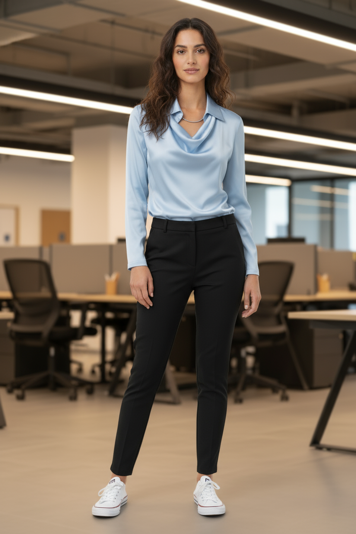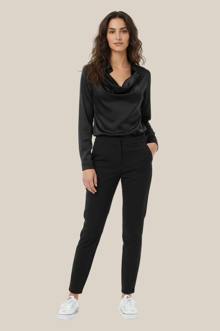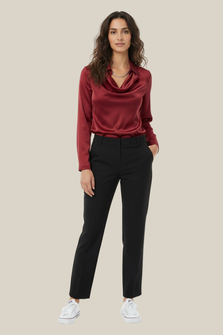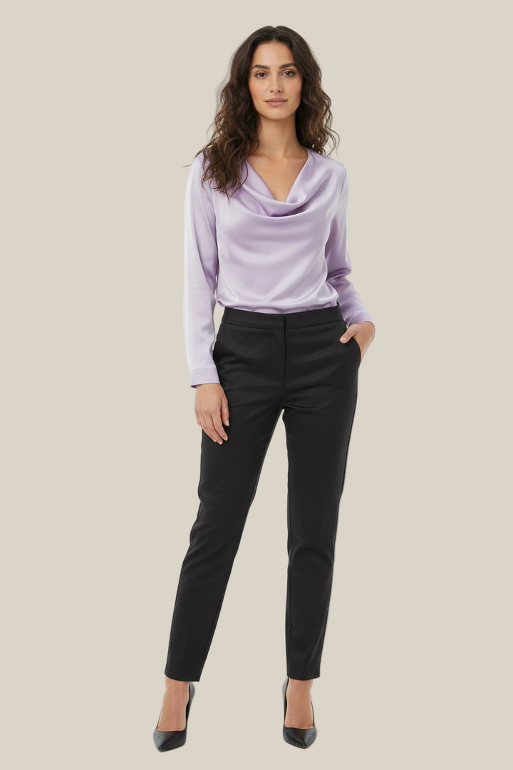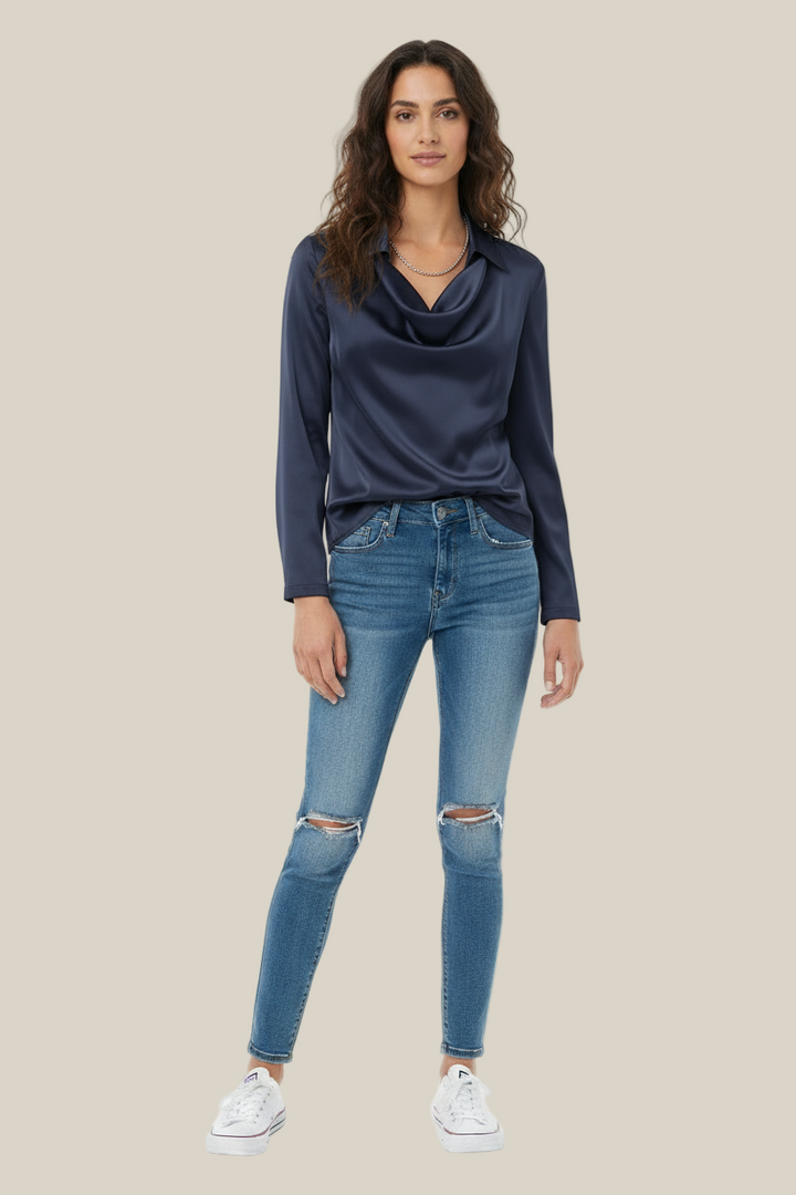 בד סאטן חלק ונעים למגע בשילוב גזרת V-Neck מחמיאה, מעניקים מראה מושלם בין אם את בדרך למשרד או לבילוי ערב.
