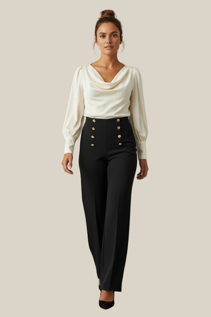 המכנסיים משלבים עיצוב מחמיא, עם גזרה ישרה והדוקה במקומות הנכונים שיוצרת מראה ארוך, צר ומעוצב. המותניים הגבוהות תומכות, מאזנות ומעניקות תחושת אחיזה נוחה לאורך כל היום – מושלם לעבודה, יציאה או ליום־יום. בד (פוליאסטר) איכותי עם נפילה יפה שמעניק מראה אלגנטי אך עדיין קליל ויומיומי.