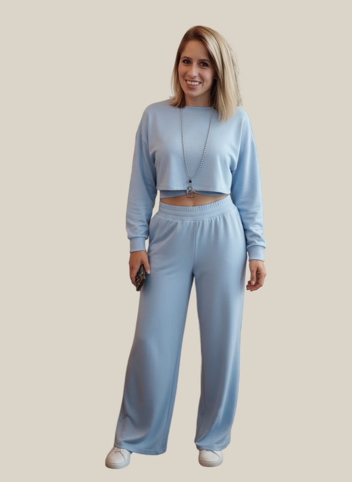 סט לנשים הכולל סווטשירט עם שרוולים ארוכים ושוליים לא סימטריים, יחד עם מכנסיים רחבות לוק אלגנטי-קז׳ואלי שמתאים לכל מצב — מאימון קל ועד ליום נינוח בעיר.