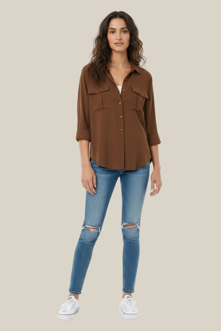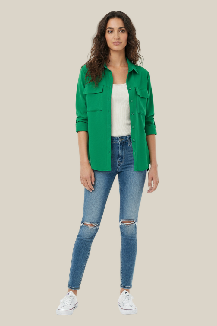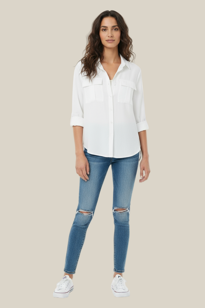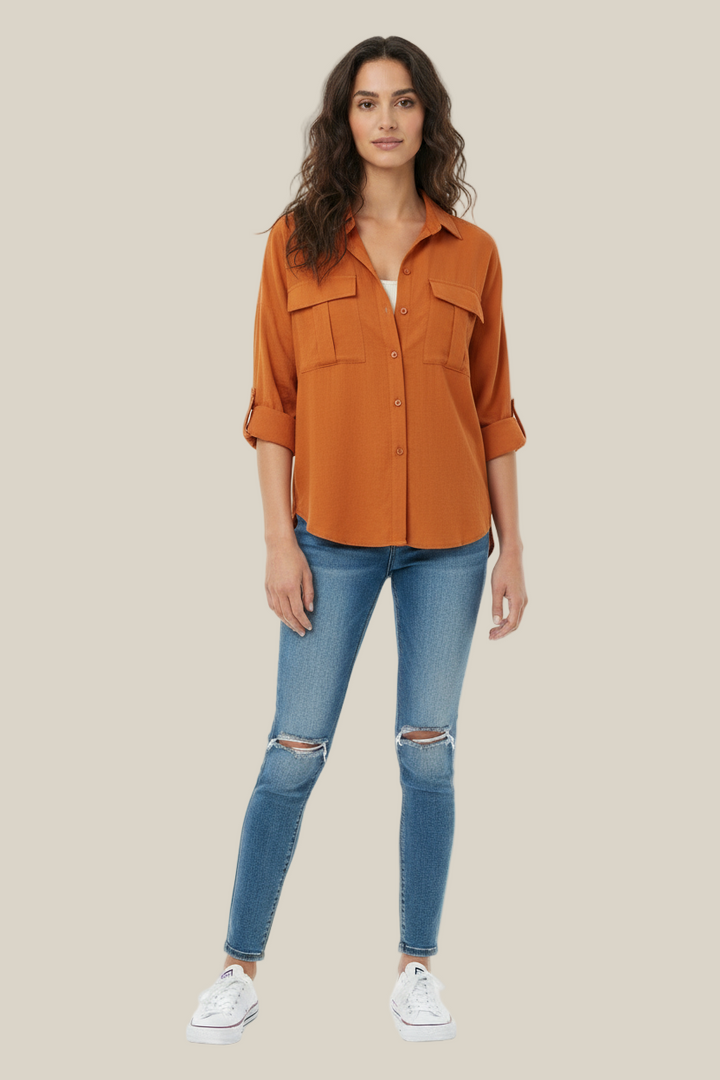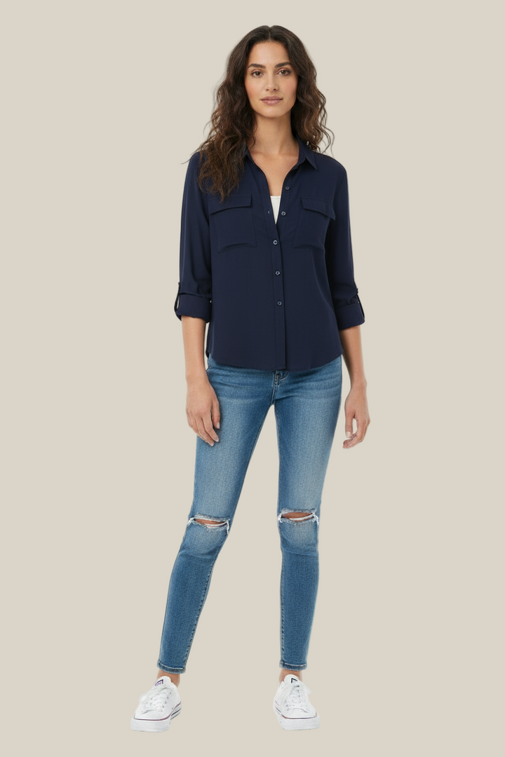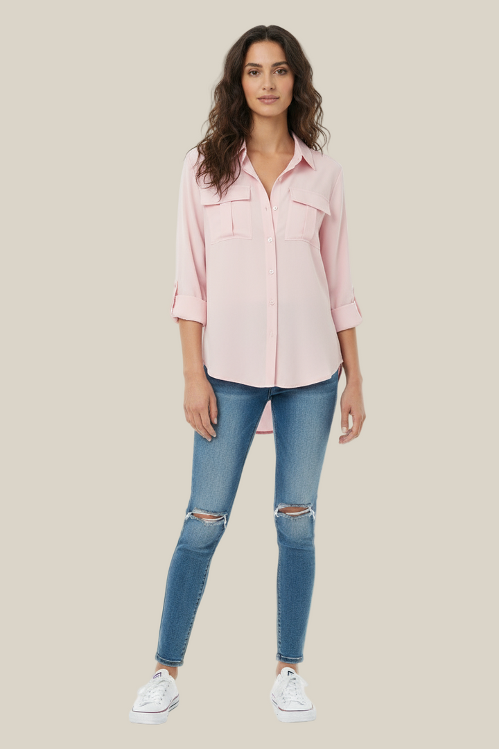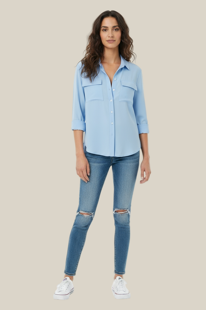 החולצה כוללת כיסים קדמיים בחזה להשלמת הלוק, כפתורים לכל האורך, וסגנון פשוט ונקי שמשתלב בקלות עם כל בגד – ג׳ינס, מכנסיים אלגנטיים או חצאית.