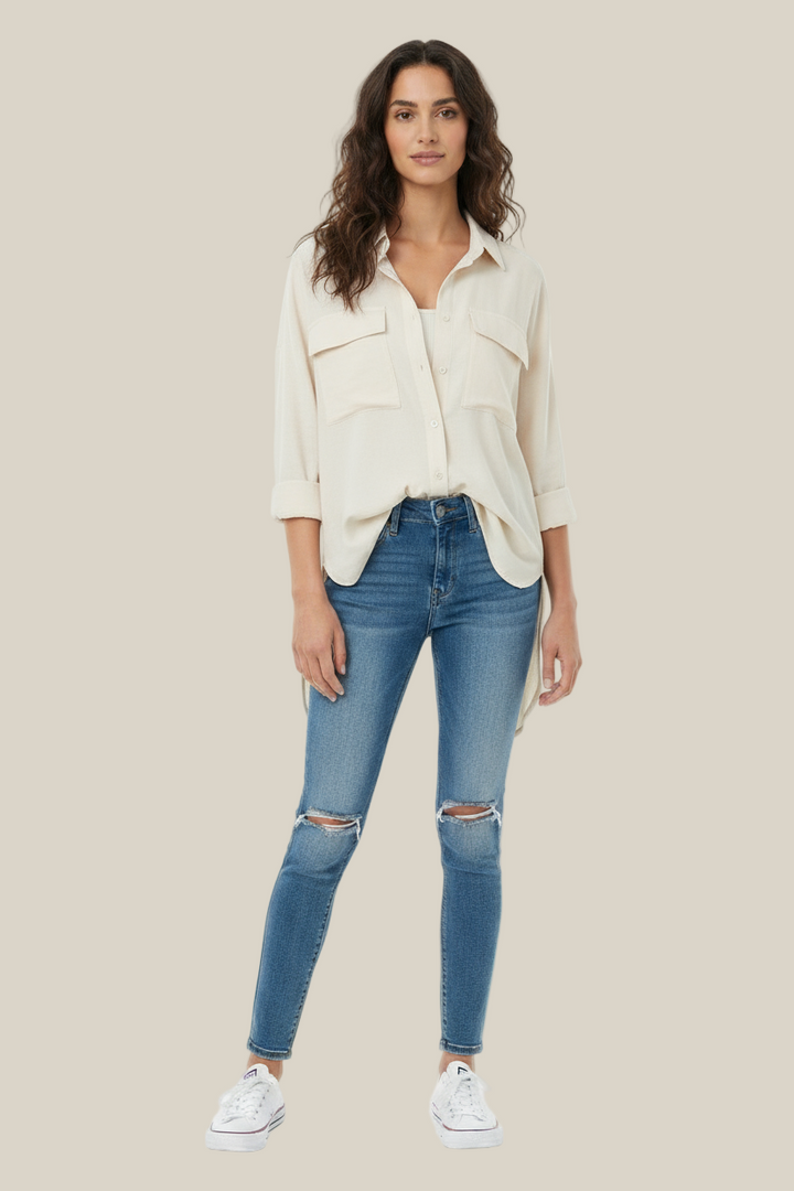 חולצת כפתורים ארוכה בעיצוב קז׳ואל קליל, עם גזרה רפויה שמחמיאה לגוף ומעניקה תחושת נוחות גם בשגרה וגם ביציאה מהבית.